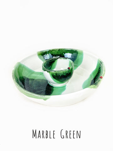 Stand out at all your parties with a hand made chip and dip platter. The dip bowl is removable for better cleaning and easy refills. Just choose glaze that matches your tastes.